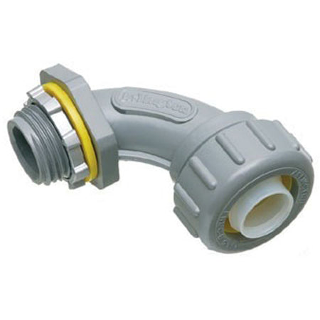 Liquidtight - Flex -Non-Metallic 90 Degrees Connectors; Size: 1 In.; Material: Plastic; Style: Push-On; Color: Gray; Dimensions: 2.874 H x 4.107 W In.; For Use With: Non-Metallic Liquidtight Conduit, Type B